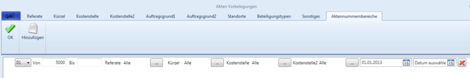 Um Bereiche zu definieren, klicken Sie auf „Hinzufügen“. Im Feld „Von“ tragen Sie Ihre Start Aktennummer ein, das Feld „Bis“ bleibt leer. Als Startdatum tragen Sie den 01.01.2014 ein. Speichern Sie zum Schluss Ihre Einstellungen mit OK.