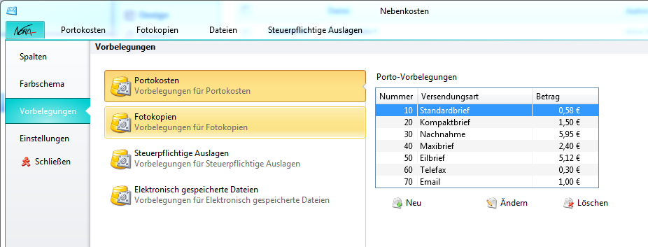 Öffnen Sie das Modul Nebenkosten und wählen Sie über das NoRA Logo den Menüpunkt „Vorbelegungen“. Markieren Sie die gewünschte Versendungsart und ändern Sie den Betrag durch Klick auf Ändern.