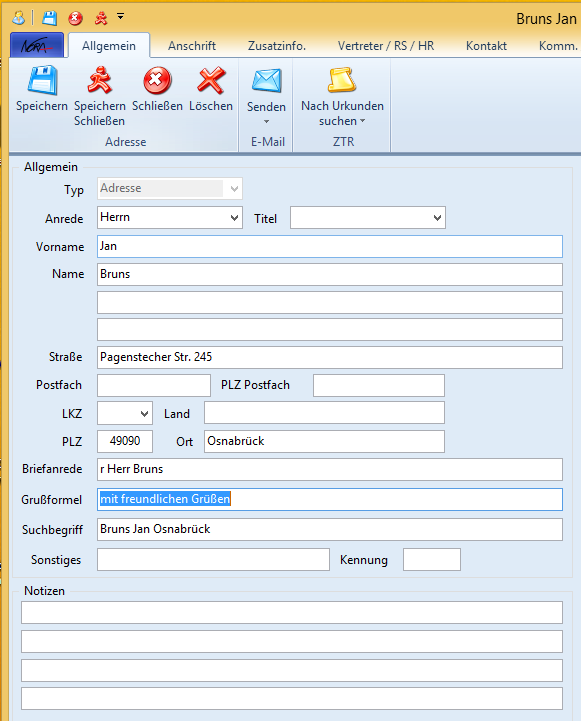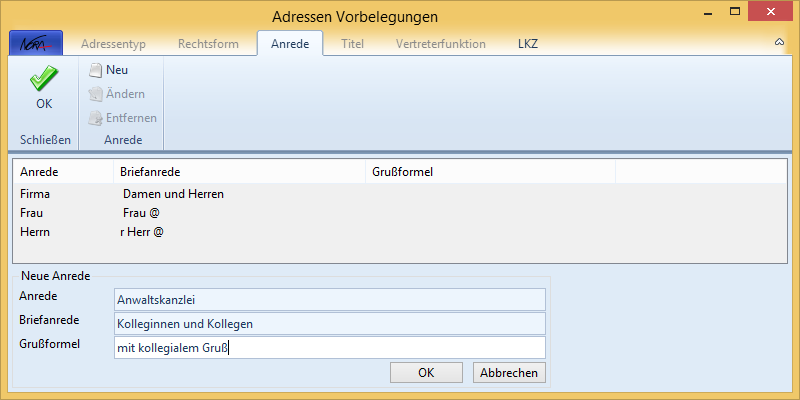 Eine weitere Möglichkeit ist, Anrede und Grußformel in den Vorbelegungen anzulegen. Die Anrede ist dann im Adresssatz auswählbar und die entsprechende Grußformel schon hinterlegt.