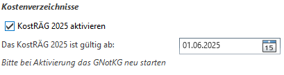 Öffnen Sie an einem beliebigen PC das Modul GNotKG und öffnen Sie mit einem Klicken oben links die Einstellungen. Unter dem Menüpunkt Einstellungen > Kostenverzeichnisse können Sie bereits jetzt schon den Haken setzen und als Startdatum den 01.06.2025 eintragen.