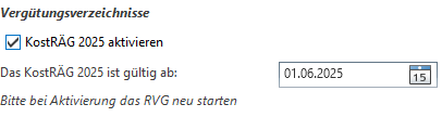 Öffnen Sie an einem beliebigen PC das Modul RVG und öffnen Sie mit einem Klicken oben links die Einstellungen. Unter dem Menüpunkt Einstellungen > Vergütungsverzeichnisse können Sie bereits jetzt schon den Haken setzen und als Startdatum den 01.06.2025 eintragen.